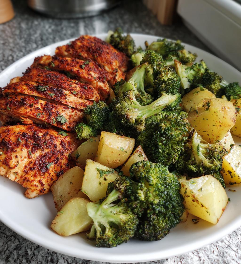 Now it’s time to cook! Place the seasoned chicken breasts into the air fryer basket first, and then add the broccoli and potatoes around them. Cook everything for 15-20 minutes, flipping the chicken halfway through for even cooking. You’ll know it’s done when the chicken reaches an internal temperature of 165°F (74°C) and the veggies are tender and golden.