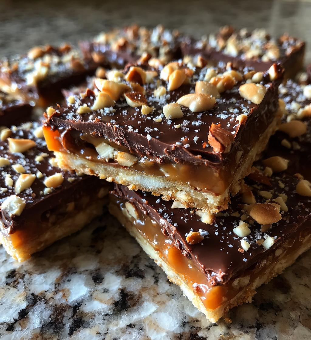 A sweet and crunchy dessert made with graham crackers, toffee, and chocolate.