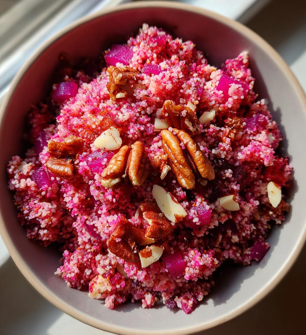A vibrant and nutritious dish featuring pink beet couscous and crunchy pecans.